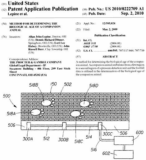 These two graphics are from a patent application we find mildly baffling. Titled “METHOD FOR DETERMINING THE BIOLOGICAL AGE OF A COMPANION ANIMAL,” US patent application #12/395,924 was filed on March 2, 2009 to inventors Allan John Lepine [pictured here], Dennis Richard Ditmer, Lori Lee Halsey and John Russell Burr. The description is brief (the body of the patent adds considerable detail, if not enlightenment):