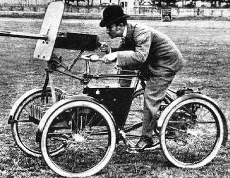 Simms’ Armoured Quadricycle, built in 1899, is considered by many to be the first armored fighting vehicle (AFV). It was the first motor vehicle designed as a weapons carrier, and had a tiny front armor shield. Frederick Simms‘ invention carried a 7.62 mm Maxim machine gun, and was both pedal and motor powered