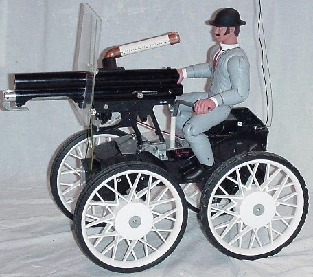 The 1/6 scale R/C Armored Quadricycle carries a servo fired 0.40 caliber Splatmatic XJ40 paint ball marker and has top speed of approximately 3 mph. The chassis and Fred Simms’ stunt double came from a Radio Shack R/C Road Rustler bought on sale for . Fred Simms’ head and hat were modified from a Wal-Mart fireman action figure. The seven inch diameter spoked wheels came from Herbach and Rademan.