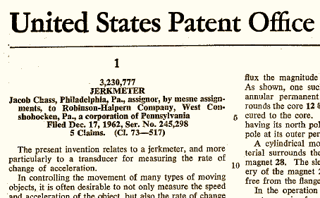 If you study jerks in a formal way, you are probably familiar with jerkmeters. Here’s a comforting treasure, the 1966 patent for one of the most beloved of all jerkmeter designs: