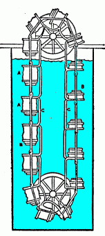 1857 [No. 1330] Peter Armand le Comte de Fontainemoreau of London, Agent. Hydraulic motor. The “bucket brigade” arrangement of buckets or bellows on a belt over two pulleys, with everything below the top pulley immersed in a tank of water. Drawing from Dircks (1861) p. 478. The patent describes it more clearly than the picture.