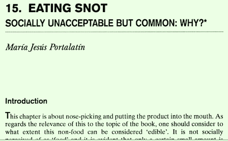 Chapter 15 of the book Consuming the Inedible: Neglected Dimensions of Food Choice is called ”Eating Snot – Socially Unacceptable but Common: Why?” Maria Jesus Portalatin wrote that chapter. Investigator Wilson Maslin brought it to our attention, and now we bring it to yours.