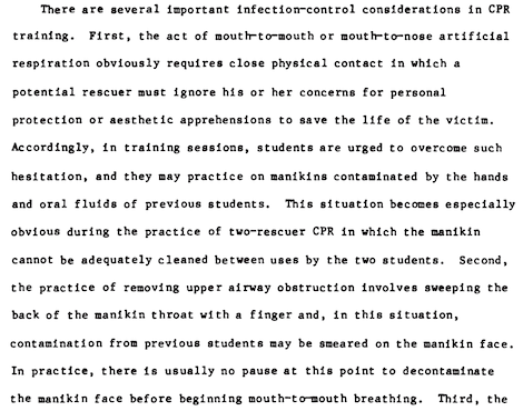 If you are or should be or ever might be in a situation where you might worry or should worry about the transmission of disease via a CPR manikin, this report is for you: