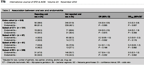 “To determine whether oral sex could be a protective factor for PID [Pelvic Inflammatory Disease] the relationship between self-reported oral sex and endometritis was analysed among 619 women with clinically suspected PID who participated in the PEACH [PID Evaluation and Clinical Health] study. Nearly one quarter of participants reported oral sex in the past four weeks. These women also reported a higher number of sexual partners, a new partner within the past four weeks and a higher frequency of sexual intercourse (all P < 0.03). They were more likely to smoke (P < 0.0001), drink alcohol (P < 0.004) and use recreational drugs (P < 0.02). Participants reporting oral sex were significantly less likely to be black or to have a positive test for Neisseria gonorrhoeae (7.8% versus 21.6%, P = 0.001). Women who disclosed oral sex were significantly less likely to have endometritis after adjusting for race, number of partners, recent new partner, smoking, alcohol use and drug use (adjusted OR 0.5 [0.3–0.8]). This is the first paper showing a negative association between oral sex and endometritis…. This hypothesis needs to be tested in further studies.”