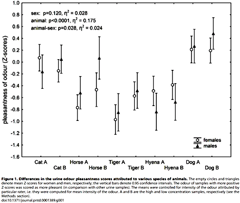 Here is a chart from the study, about the odour pleasantness of urine that was attributed to horse, tiger, brown hyena and dog:
