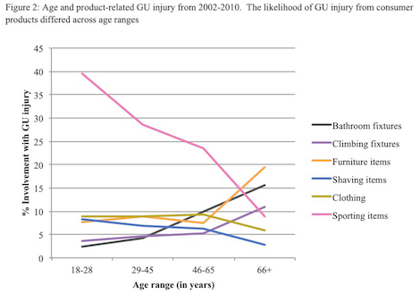 The data in this study indicate that, on a gross society basis, male parts are more often injured by products than are female parts, and that sporting goods are often involved, though more often for younger males than older ones, and that, sporting good aside, zippers are often implicated.