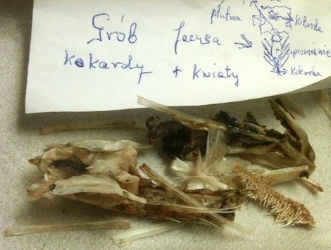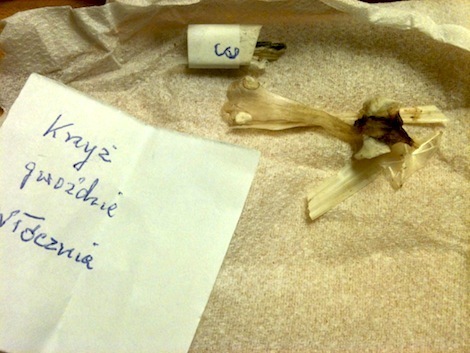 A package arrived here, at our offices in the US, from a man in Poland. The package contained a letter and several little collections of tiny bones. (Each little collection was wrapped in its own piece of paper, and contained, in addition to the bones, a tiny slip of paper with a few words written on it.) The writing was all in the Polish language — which alas we do not read.