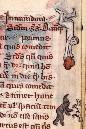 This image [below], of a naked man holding a boulder as both hurtle down towards a meeting with what may be a homunculus playing with an airborne dog, puzzles some scholars who study medieval documents. It — and many other unexpected drawings, quite a few of which feature naked people pursuing vigorous activities — populate the margins of a book known as the Rothschild Canticles. The Got Medieval blog writes about it, and about many other curiosities from the same long era. Got Medieval quotes Yale University Press about the Rothschild Canticles: