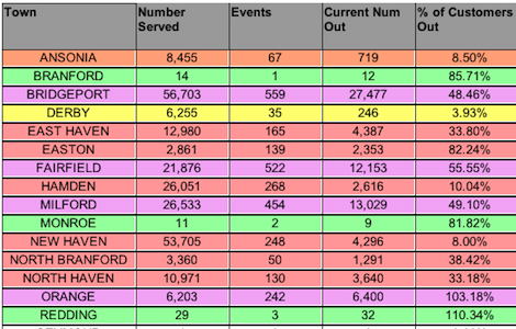 This chart, created by The United Illuminating Company, shows how Connecticut cities and towns are still affected by the recent hurricane. It says that 110.34% of the electricity customers in the town of Redding are still without power. The United Illuminating Company’s web site says, in big letters, “WE ARE IN STORM MODE“.