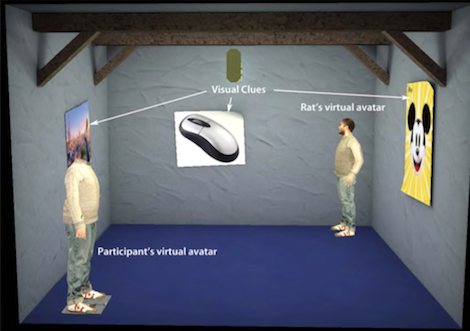 “The participant in the IVR [Immersive Virtual Reality] is represented in the destination by a physical robot (Teleoperator) and simultaneously the remote place and entities within it are represented to the participant in the IVR…. Here, we show how such a system can be deployed to allow a human and a rat to operate together, but the human interacting with the rat on a human scale, and the rat interacting with the human on the rat scale. The human is represented in a rat arena by a small robot that is slaved to the human’s movements, whereas the tracked rat is represented to the human in the virtual reality by a humanoid avatar.”