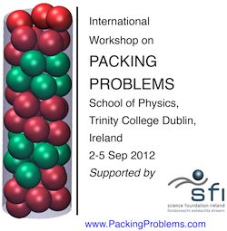 Make your travel plans now for the next International Workshop on Packing. This year’s, held in Dublin in a “packed house”, has just concluded, the participants (all of whom have intriguingly packed schedules) efficiently stuffing their travel accoutrements and dirty clothes into backpacks and suitcases, and hastening back to their labs and homes. The conference’s promoters described the entire affair using some (for once!) unsexy language: