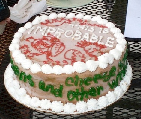 Special thanks to Gus Rancatore and his fellow wizards at Toscanini’s Ice Cream for creating (and surprising me with) an Improbably-beautiful, and delicious, one-of-a-kind ice cream cake that recreated the cover of my new book, This Is Improbable. Here’s a photo of that cake (which no longer exists, having been devoured), and a look at the cover. Jean Berko Gleason took the photo. The book cover was designed by Andy Bridge, whom I hope to meet some day so I can thank him for creating something that perfectly transmits the spirit of the book.
