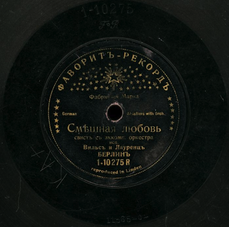 This photo shows a recording of “whistlers with orchestra” labeled in Russian, reproduced in Germany in English, sort of. Follow the link to hear this scholarly treasure and see more detail about it:
