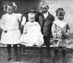 Can anyone help me identify the disgruntled children in this photograph? This is a science puzzle, and I want to know the answer. My professor when I was living in the United States gave me this as a sort of humorous scientific historical gift. He was that kind of professor. It came with a set of clues. He said that three (3) of the children grew up to be famous scientists, one (1) grew up to be a famous international financier and criminal, two (2) are female, two (2) are male, one (1) famously loathed wearing shoes, two (2) were involved with theories about quarks, all (4) excelled at mathematics, and one was involved in a famous quarrel in Paris.