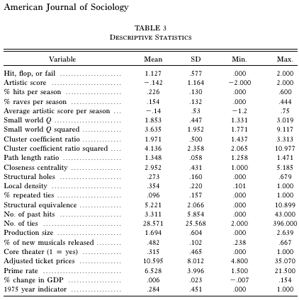 The authors analyzed the small world network of the creative artists who made Broadway musicals from 1945 to 1989. Based on original arguments, new statistical methods, and tests of construct validity, they found that the varying “small world” properties of the systemic level network of these artists affected their creativity in terms of the financial and artistic performance of the musicals they produced…..