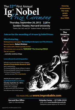 The 2012 Ig Nobel Prize Ceremony will happen exactly a month from today—on Thursday night, September 20, at Sanders Theater, Harvard University. Details are on the ceremony web page.