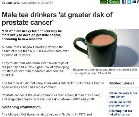 Here’s an example, from the BBC news web site. The headline, as you can see, says: “Male tea drinkers ‘at greater risk of prostate cancer‘”: