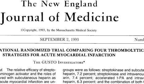 “An international randomized trial comparing four thrombolytic strategies for acute myocardial infarction,” The GUSTO Investigators, New England Journal of Medicine, vol. 329, no. 10, September 2, 1993, pp. 673-82.