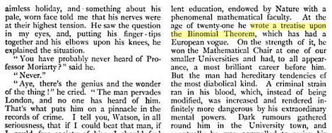 "Aye, there's the genius and the wonder of the thing!" he cried…. "He is a man of good birth and excellent education, endowed by nature with a phenomenal mathematical faculty. At the age of twenty-one he wrote a treatise upon the binomial theorem, which has had a European vogue. On the strength of it he won the mathematical chair at one of our smaller universities…"