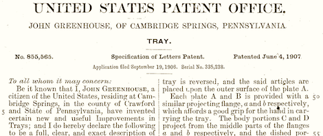 John Greenhouse gasses on about trays, in the very first words of his patent, #55565, issued on June 4, 1907: