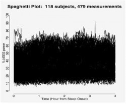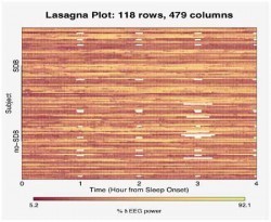 But Bruce J. Swihart and his colleagues Brian Caffo, Bryan D. James, Matthew Strand, Brian S. Schwartz, Naresh M. Punjabi at the Johns Hopkins University Bloomberg School of Public Health, Department of Biostatistics, Baltimore, USA, have between them created a new recipe for epidemiologists – who may now be able to avoid becoming embroiled in spaghetti plots, by using instead the team's newly created 'Lasagna plot' method, which as the picture below shows, is substantially less bewildering. And more colourful too.