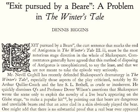BONUS: For a further — but earlier and disagreeing — look into the question, see "'Exit Pursued by a Beare': A Problem in 'The Winter's Tale'", Dennis Biggins, Shakespeare Quarterly, Vol. 13, No. 1 (Winter, 1962), pp. 3-13 1962.