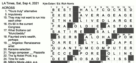 The Ig Nobel Prizes have again turned up in a crossword puzzle, this time as a clue in the September 4, 2021 puzzle in The Los Angeles Times. The clue for one of the across words is: