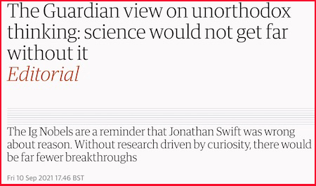 A September 11, 2021 editorial in The Guardian focuses on the Ig Nobel Prizes, Jonathan Swift, and science, though not necessarily in that order: