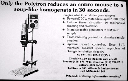 The nature of the product may already have been familiar to many people because of a charming old ad, reproduced here (thanks to Scott Langill for bringing it to our attention). The ad features the comforting headline: “Only the Polytron reduces an entire mouse to a soup-like homogenate in 30 seconds”: