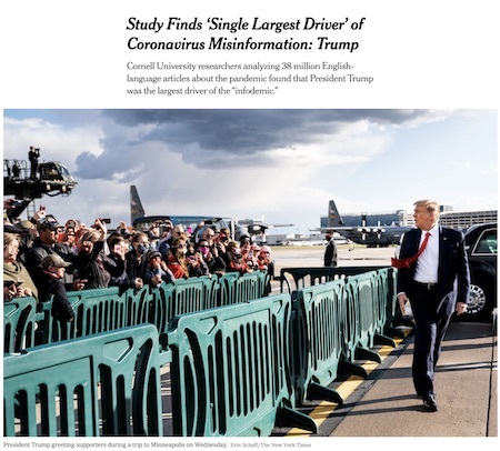 “The COVID-19 pandemic has unfolded alongside what the World Health Organization has termed an ‘infodemic’ of misinformation.This study identifies and analyzes the most prominent topics of COVID-related misinformation… We found that media mentions of US President Donald Trump within the context of COVID-19 misinformation made up by far the largest share of the infodemic. Trump mentions comprised 37.9% of the overall misinformation conversation, well ahead of any other topics.We conclude that the President of the UnitedStates was likely the largest driver of the COVID-19 misinformation ‘infodemic’ “.