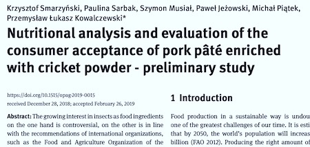 “Nutritional Analysis and Evaluation of the Consumer Acceptance of Pork Pâté Enriched with Cricket Powder – Preliminary Study,” Krzysztof Smarzyński, Paulina Sarbak, Szymon Musiał, Paweł Jeżowski, Michał Piątek, and Przemysław, and Łukasz Kowalczewski, Open Agriculture, vol. 4, no. 1, 2019.