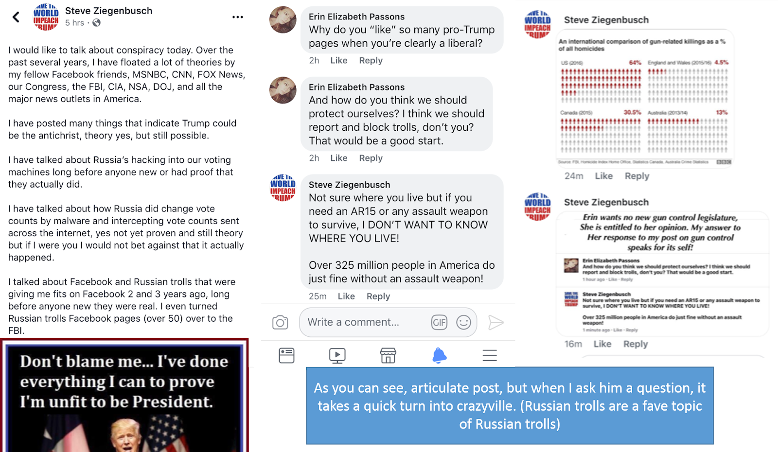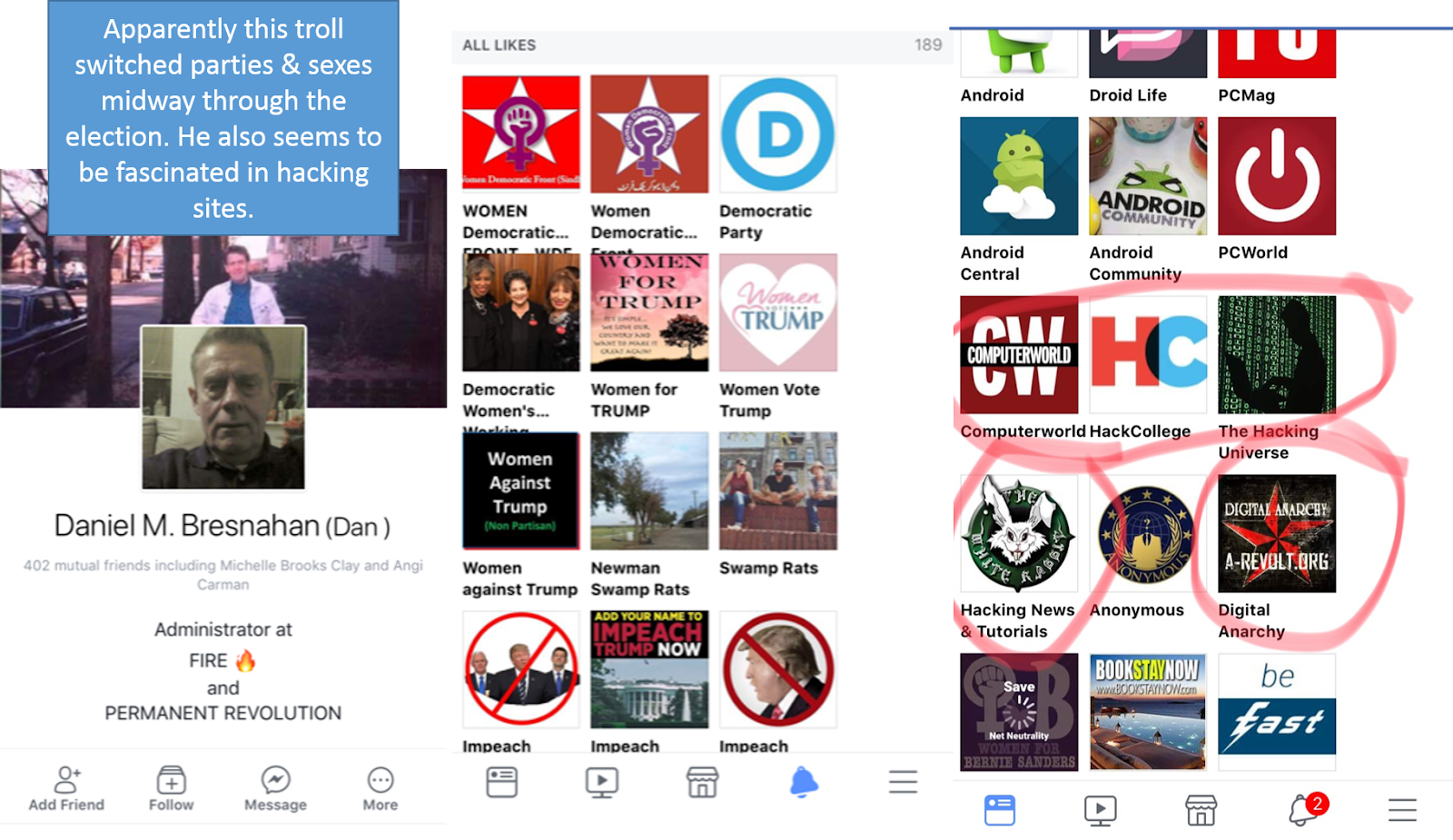 Pages, however, is a section of Facebook often ignored by trolls. They spend a lot of time “liking” pages that fit into the image they are trying to convey, but they forget to remove “likes’ from a previous personality. If you study their page “likes,” it’s quite possible you’ll find page “likes” for conflicting issues – such as a “like” for “Trump is a Big Orange Clown” and a like for “Trump for 2020.” Trolls will also forget that they are on their hacked accounts, and “like” pages in their native language, or a topic that is juxtaposed to the account’s identity—for example, a retired Presbyterian school teacher from Indiana “liking” a page for Ukrainian strippers.