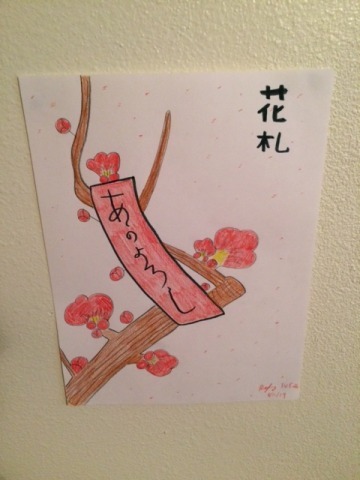 That was yesterday, the day of my fight. This day I woke up at 2 AM and cooked rice and eggs plus broccoli I swiped from the fight catering that they bring us on fight days. I couldn’t sleep, so at 3:30 AM I sat at the kitchen table and drew two Japanese hanafuda cards with the colored pencils Shana and DeAnna requested from the House Fairies.