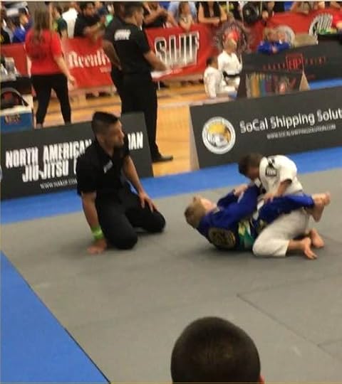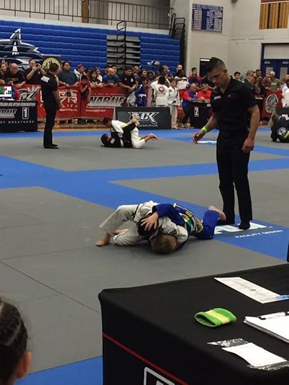 So Saturday I coached my student Preston at his first jiujitsu tournament. There was only one other kid in his division. He used to be hesitant to do takedowns, and if he felt himself failing, he would fall on his butt (and promptly get mounted) rather than risk being thrown and slammed. So we’ve been training takedown strategy so much. I’m so proud of the fact that he went out there and bravely grabbed his opponent!