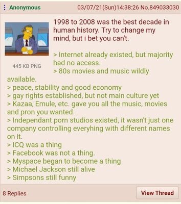 Normie-free internet - Clearly he never saw MySpace. The real golden age of the internet as exclusive nerd social club was the 90s. But narcissists dislike contemplating the world before they existed.