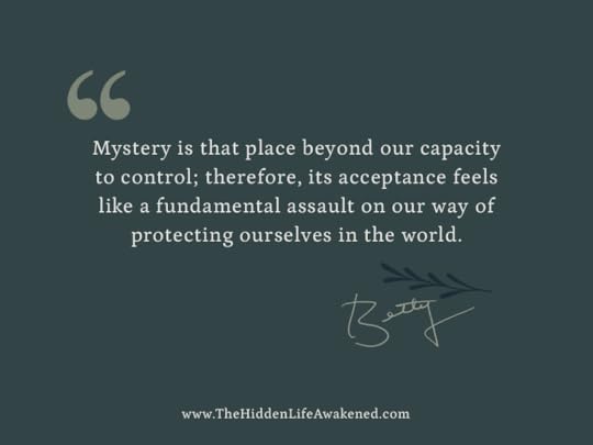 Mystery is that place beyond our capacity to control; therefore, its acceptance feels like a fundamental assault on our way of protecting ourselves in the world. ~Betty