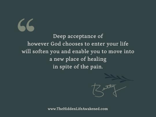 Deep acceptance of however God chooses to enter your life will soften you and enable you to move into a new place of healing in spite of the pain. ~Betty