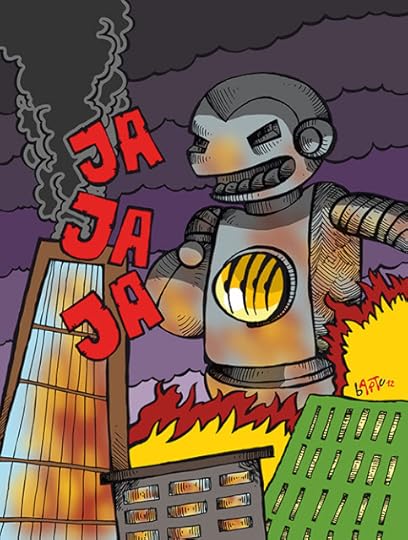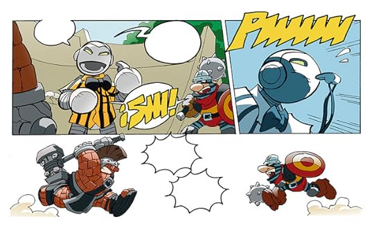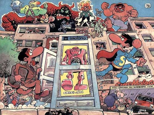 Ese muestrario de superheroes de pacotilla y supervillanos que se hacían querer ha quedado para siempre en nuestro subconsciente colectivo. Este Supergrupo, este quiero y no puedo de Los Vengadores o la Liga de la Justicia , que se pasa más tiempo peleandose entre ellos por cualquier chorrada que haciendo algo heróico, o cuanto menos útil. Ese Superbanco donde los supers van a guardar sus dineros, a pedir un crédito o a cobrar la pensión, ofreciendonos todo un muestrario de personajillos en mallas, que van del claro homenaje al viejillo con capa y boina, mas un par de atracadores despistados que vienen una y otra vez a cobrar, pero más que una estera. Ese personaje misterioso, ese villano sin nombre, de negra faz sin rasgos siempre mascando un enorme puro, que dibujé mil veces, aptrendiendome al dedillo su armadura del más puro estilo Jan. Y es que esa forma que tiene Jan de dibujar tecnología daría para un capítulo aparte. De crio me fascinaban las instalaciones secretas que aparecían en El Señor de los Chupetes , la nave de los Alienígenas , o la base de este villano, donde prepara la gran amenaza contra nuestros (anti) heroes: Un robot gigante que es una fusión grotesca y graciosima de todos ellos.