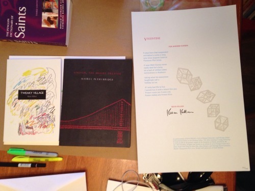 Spoils from last night’s Kevin Killian reading at Naropa. Jefferey drove up with us to meet Kevin early for a broadside signing. Kevin presented photos, a gorgeous talk around them, and some wonderful poems. Jefferey gave us a copy of his book, which I’ve been wanting to dig into. Good night…