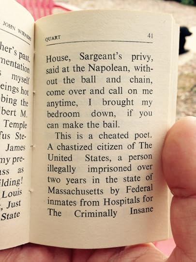 Okay, I’ll be the grouch: while I’m excited that some of John Wieners’ work is newly available in the new selected from Wave Books, I can’t fathom how a team of three editors couldn’t even muster an intro or any apparatus for context, and I’m not sure why it wasn’t just a collected or a facsimile edition of the entirety of CINCINNATI PIKE. In mild protest, posting a few pages of one of my favorites that got left out. From his CONJUGAL CONTRARIES & QUART (Hanuman Books, 1987).