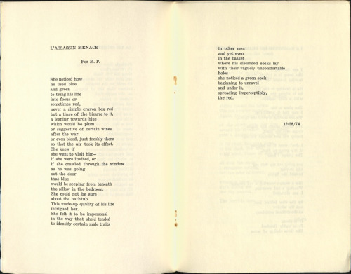 In Creeley’s talk of ‘the people,’ the distance isn’t easy—much like the distance between himself and Bobbie Louise Hawkins that he traces in “Away.” The people seem to stand at odds with his attempt to locate a place where, in relation to Hawkins, that distance could be bridged, and yet he seeks the people out as part of his vocation. Given the dedication to Hawkins, this poem might read as a love letter, but I love how quickly complicated it gets that there’s an audience—and that she’s in it, somehow, out there, with them—that the poem was published in a book, that he read it at least once for a crowd (at Goddard College, May 18, 1973).** The poem could be rededicated, “For Bobbie & the so-called people.”