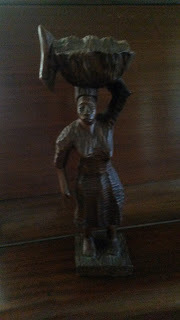 When he visited, I set a lightly varnished 35 cm" wooden statue on a table to inspire him to find the right words for the assignment. The artist had chiseled a standing woman balancing a full basket of ground provisions on her head. It had been in the house for more than 50 years and belongs to my mother-in-law who bought it on a cruise ship stop in Haiti. There is a carving of about the same size in my parents' house that was also made in Haiti, but that statue is unvarnished, and aside from a tie head, the woman who is squatting carries nothing on her head. I also own a polished Lignum Vitae carving of a woman of about the same size, but mine was done here in Jamaica, and she is bending backwards. Women bearing real and mental burdens, and contorting themselves are all around me.