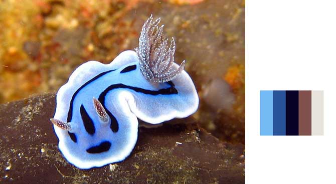 Nudibranch is a soft mollusk that sheds its shell after their larval stage. What is really astonishing about these creatures is their striking patterns and colors! The Colour Lovers blog actually have a really great article on the color breakdowns of each one.