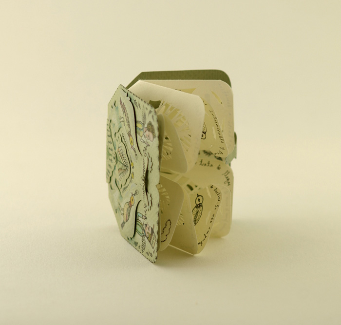 The pop-up card itself is a four panel hinged reflective foil base that flattened out to represent the shimmering water under the rainbow that swings on a v-fold to complete the familiar arch. It was conceived by Cai Gou-Qiang and created by Japansese paper engineer Takaaki Kihara, a disciple of Masahiro Chatani and a well-known figure in field of origamic architecture. The design aesthetics are similar to his other works where the pop-up elements are cut and constructed from a single sheet of paper leaving a symmetrical pattern in the base page.