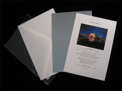 This movable card showcases a 15-second fleeting moment that occurred over the East River in New York on June 29, 2002. Transient Rainbow employed 1,000 multicolored peony fireworks to suspend a vivid rainbow against the dark New York skyline. With the reflection from the water, you get the impression of the always inspiring, double rainbow or circular rainbow. You can see more images and even a video from the event on his website by scolling down through his 2002 projects.
