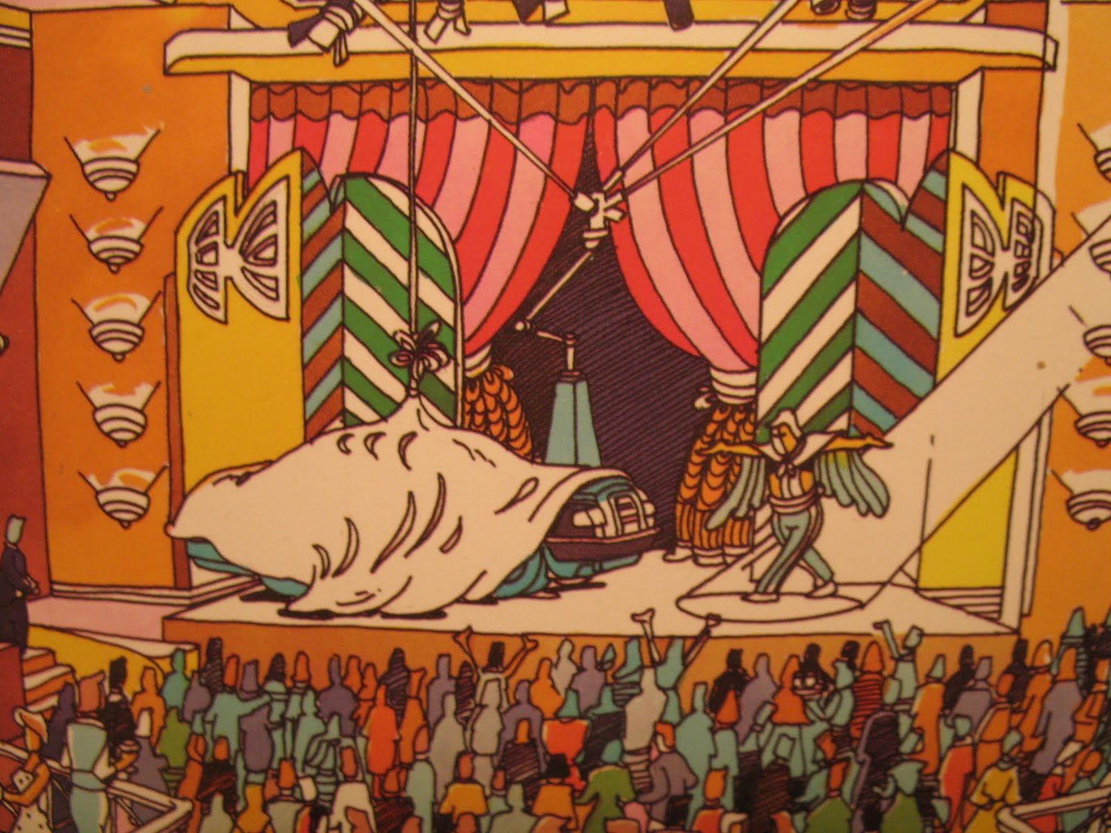 Today's selection is another mysterious pop-up advertisement. Back in the 1990's Mercedes-Benz wanted to hand you "your passport to 21st century motoring". Sadly, the faux passport that accompanied this pop-up mailer has gone missing, which would have shed some light on this campaign. Luckily, we can still enjoy the pop-up as is. This type of promotion would have been handed to potential clients or sent through the mail. Once taken out of the large envelope, the rubber band springs open a colorful car showroom, where a creepy looking magician/entertainer (who is a dead ringer for a chubby Dr. Doom) is unveiling the new Mercedes-Benz car model. If this is my passport to the future then it appears that I have nothing to declare.