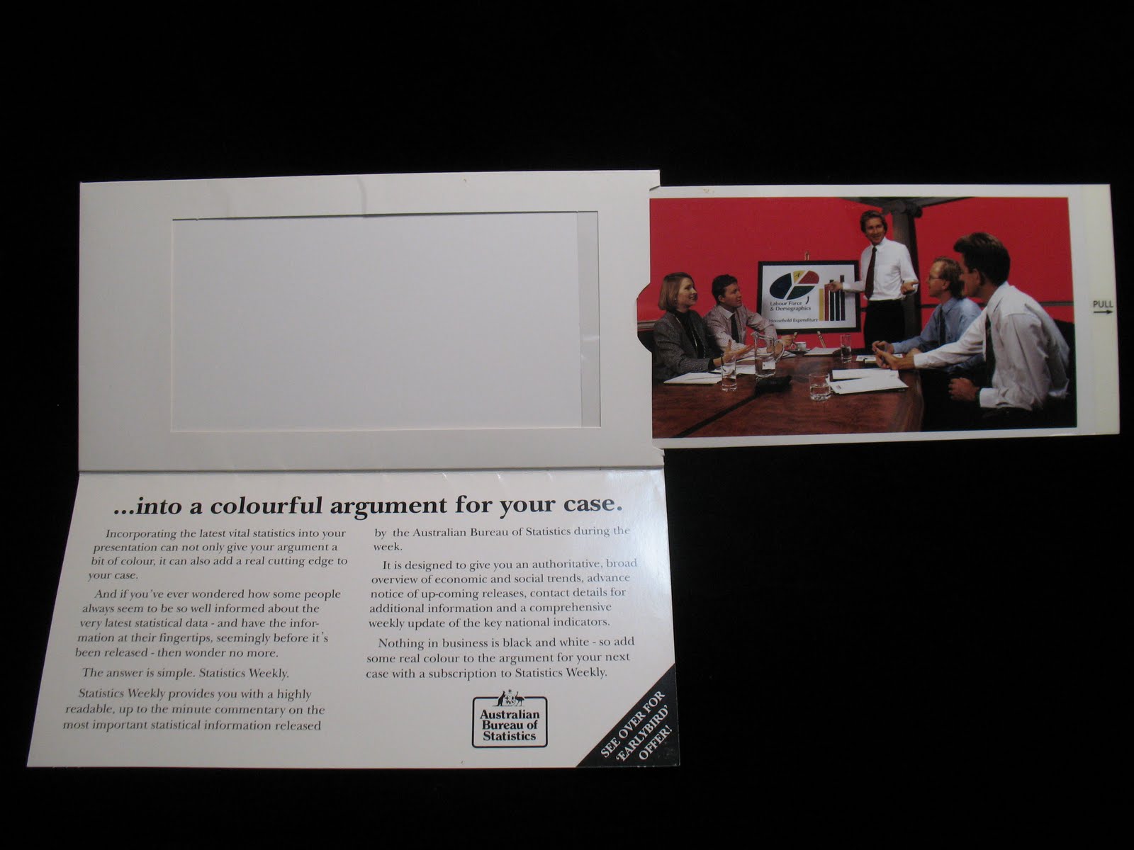 Another interesting advertisement from the Land Down Under. There is no date but by looks of the clothing and hairstyles I'll put this in the late 80's (but then again I remember seeing a lot of mullets in my travels in Australia in the late 90's, so who knows). The Australian Bureau of Statistics wants to make your life a little more colorful by providing access to their Statistics Weekly commentary. To illustrate the point the movable mailer employs a clever mechanism. I don't want to ruin the magic on this one so just sit back and enjoy the video.