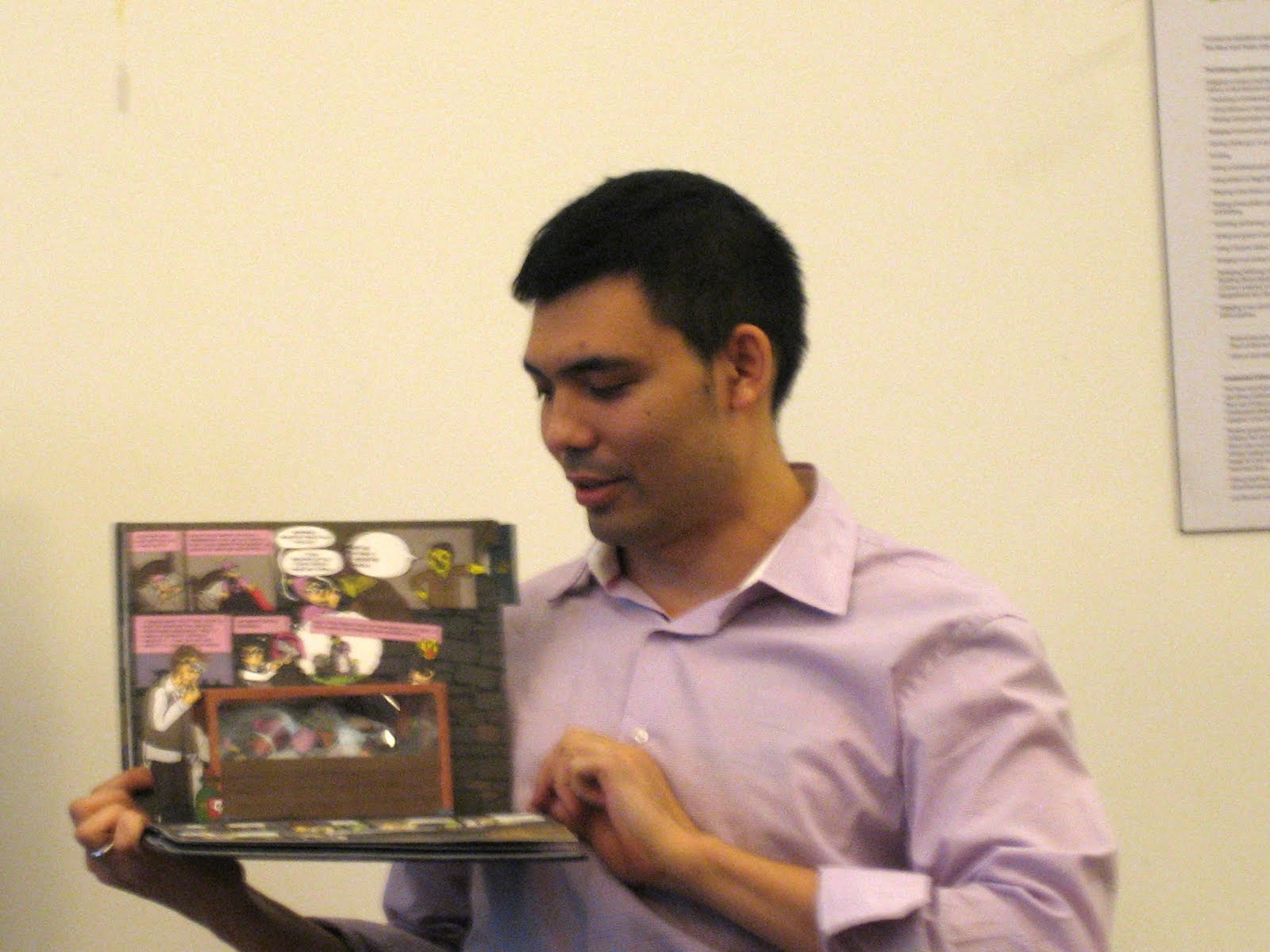 Once I discussed some ideas behind my pop-up books Castle and Baby Signs, Sam displayed his latest title, Frankenstein. I was delighted to learn more about the various versions he created to tell the occasionally gruesome story. Sam even touched on the fascinating idea of free will as he described the automatic pop-up movements of the Monster versus the viewer activated pull tabs that brought the townspeople's actions to life.