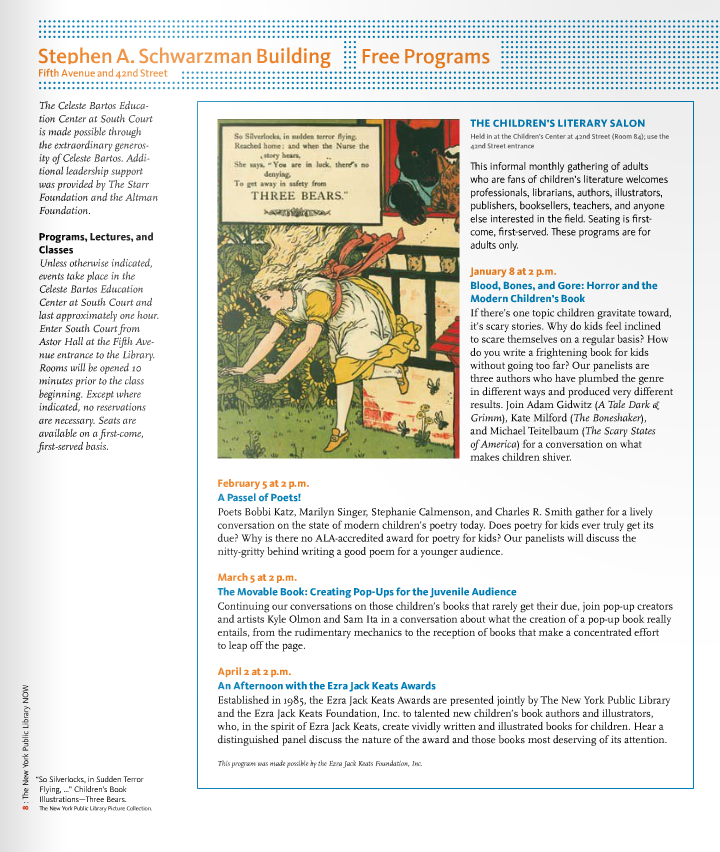 To that end, I am pleased to participate in this month's Children's Literature Salon at Children's Center in the Stephen A. Schwarzman Building at 42nd Street. The Children's Literary Salon is a monthly gathering of adults who are fans of children's literature. Professionals, librarians, authors, illustrators, publishers, booksellers, teachers, and anyone else interested in the field are welcome to attend our meetings. The Literary Salon provides a rotating series of talks with professionals in the field, and great conversation. This program is for adults only and is a first come, first seated event.