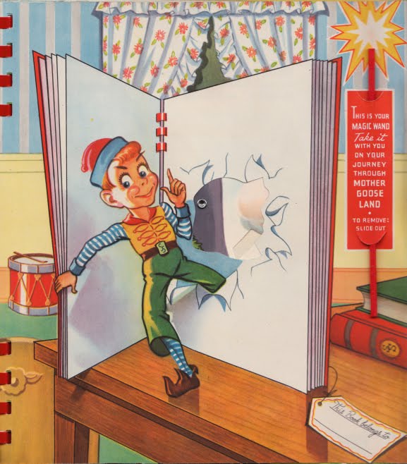 Simple Simon's Mother Goose Magical Picture Book is a curious and coveted book. The cover boasts that it includes a "magic wand that brings characters and verses to life in realistic action". Is there any kid (or adult, for that matter) that would not want a magic wand to control characters in their favorite nursery rhymes? In this case, the wand is a red wooden dowel, it's magic comes when the tip ratchets a fixed wheel in the center of the page. It is a clever spin on the traditional movable wheel and the uncredited paper engineer did not stick with one template and varies the movement and utilizes both sides of the page as the reader takes a journey with Johnny and Mary to Mother Goose Land.